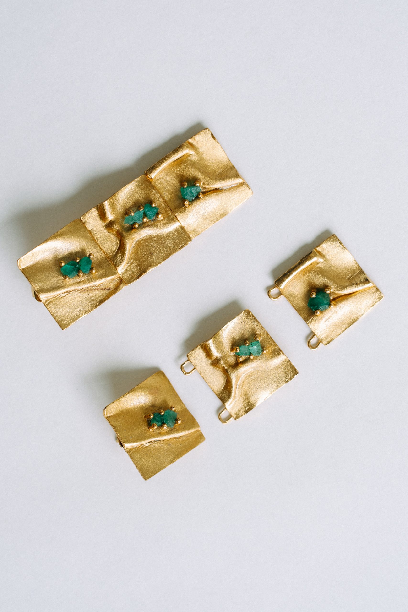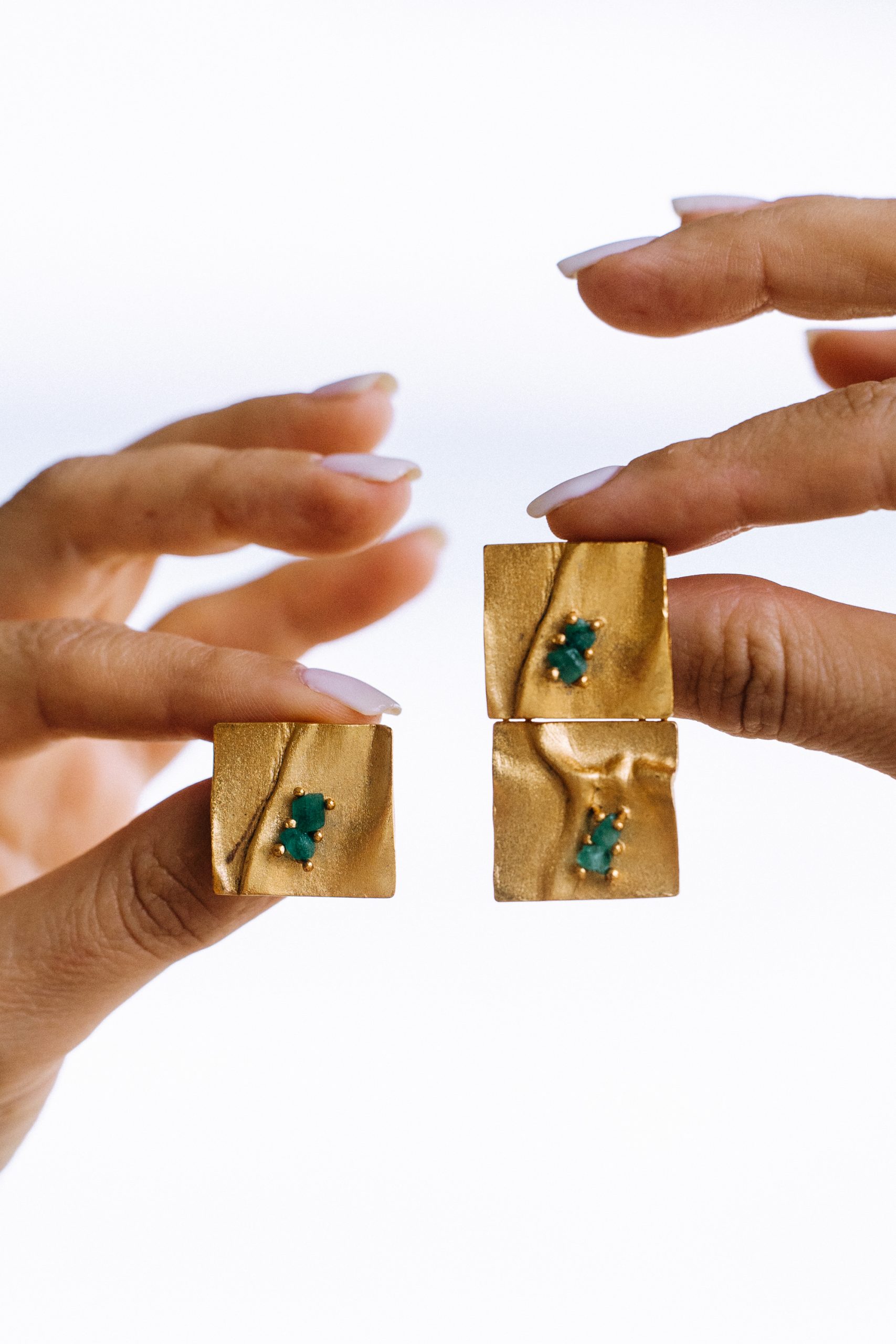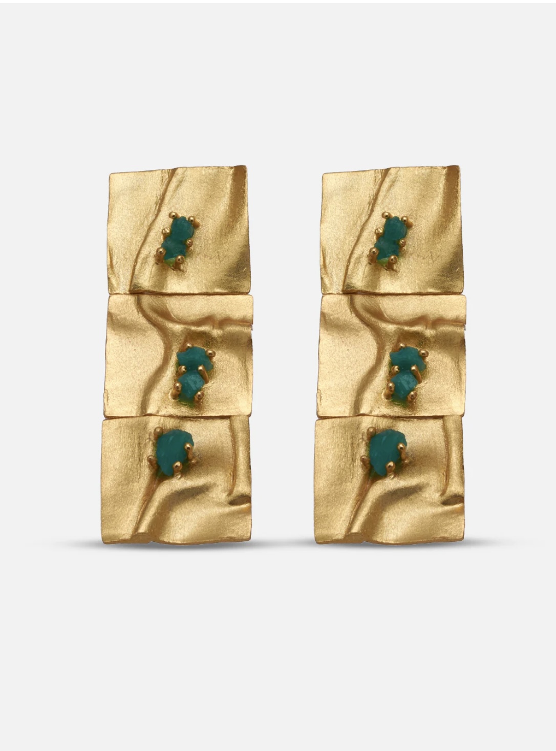 Each pair is a work of art handcrafted by our artisans. Colombian emerald crafted in 24 carat gold plated bronze. Discover beauty and versatility with the Nyia earrings.