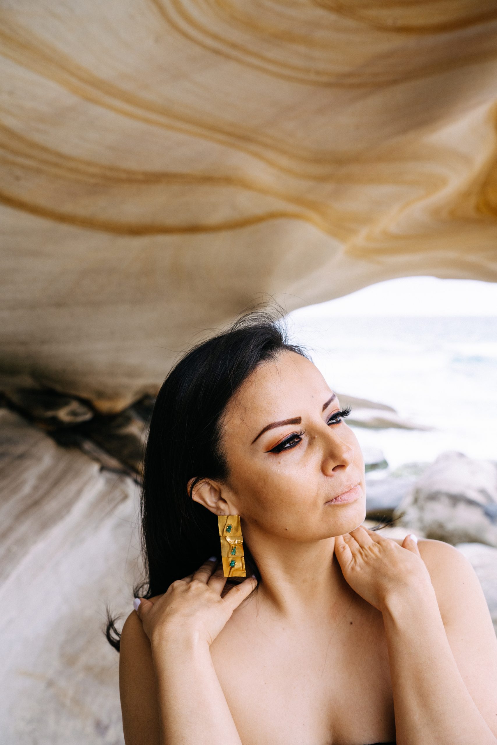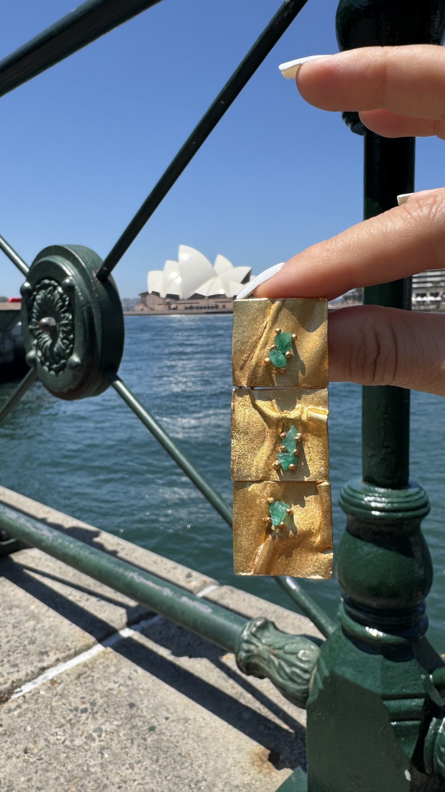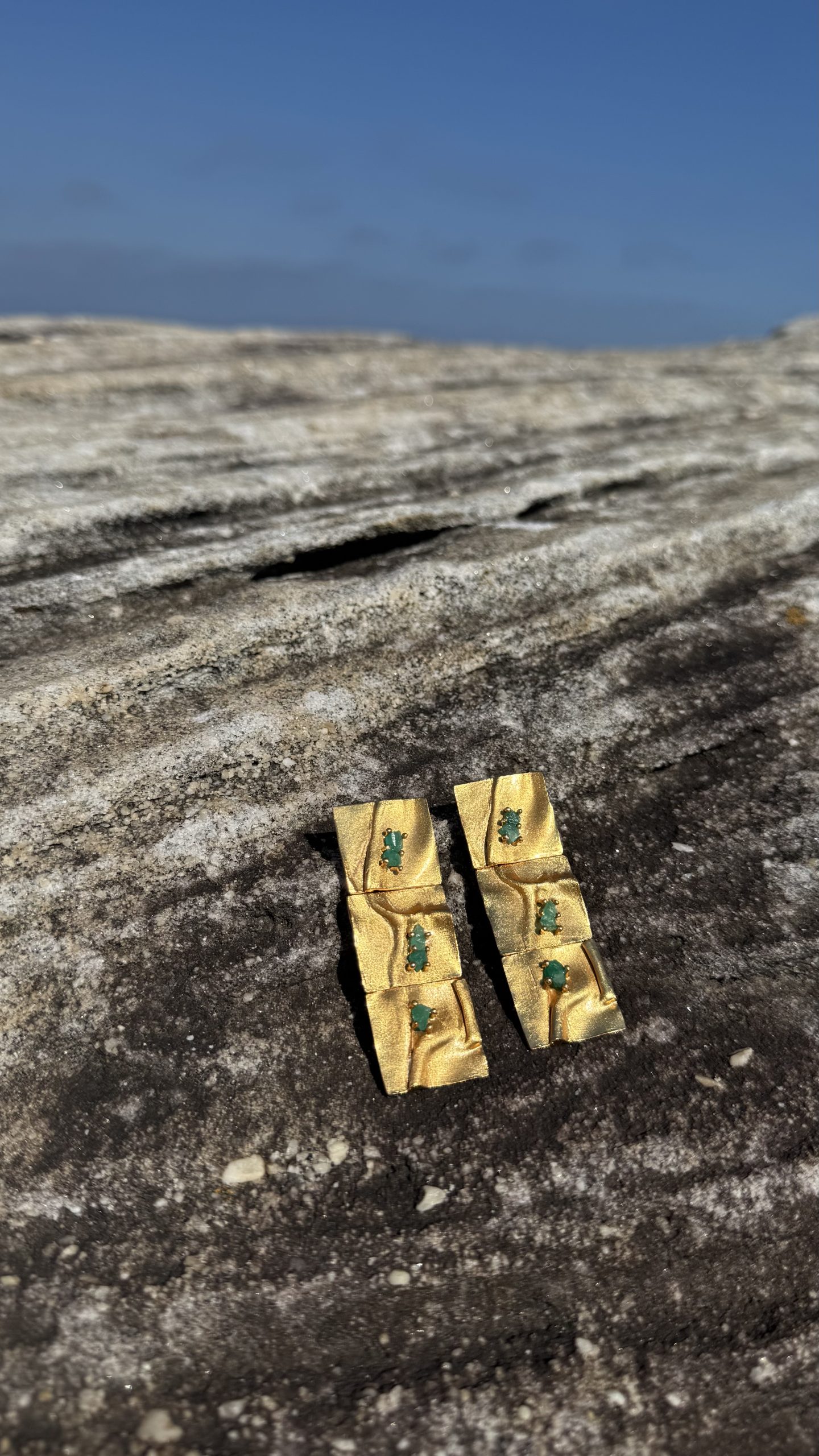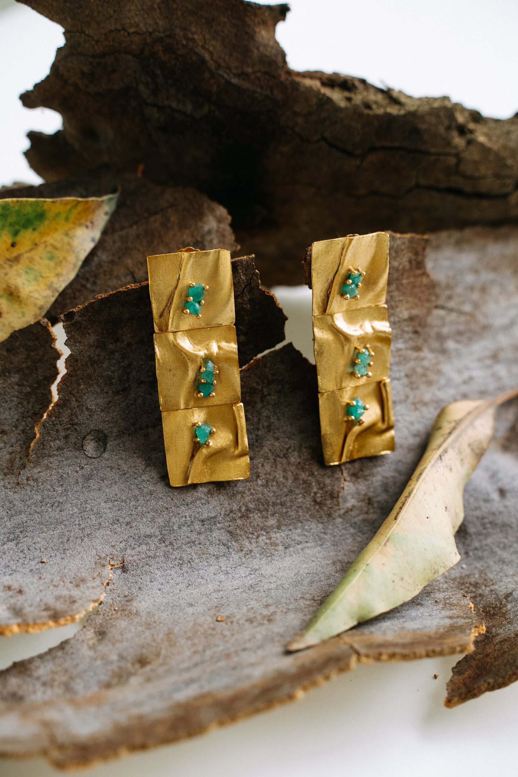 Crafted in bronze and gold-plated, adorned with exquisite Colombian emeralds. Experience the elegance and charm of Colombia with our earrings