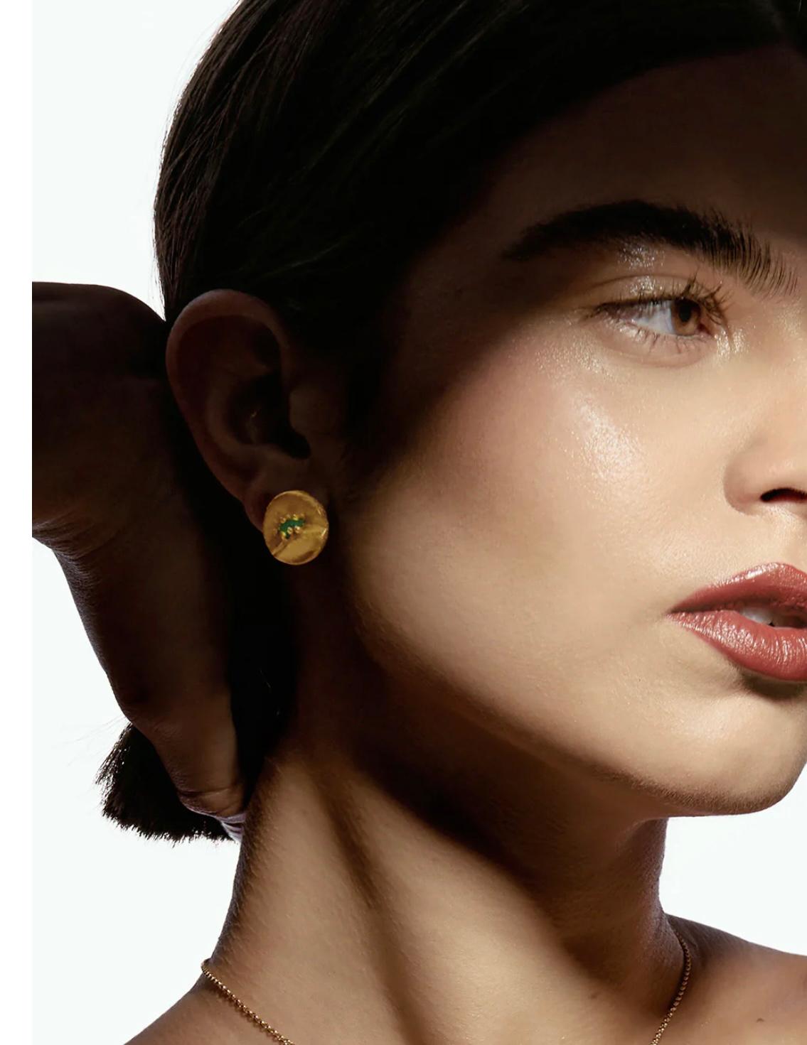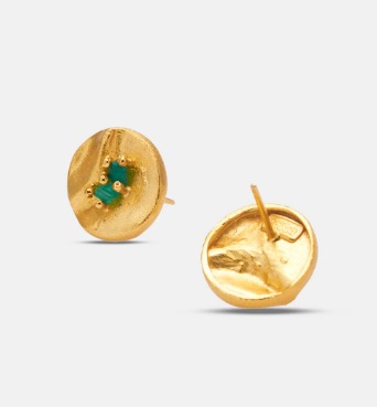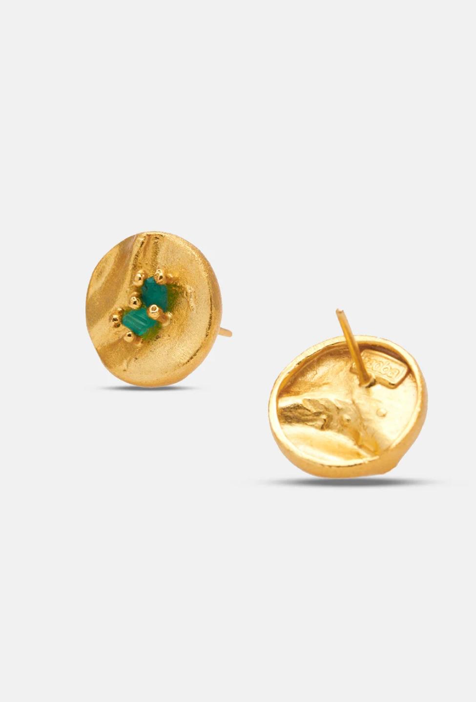 The Sune earrings are a creation inspired by the texture of fire, made by artisans in our studio. Colombian emerald crafted in 24 carat gold plated bronze.